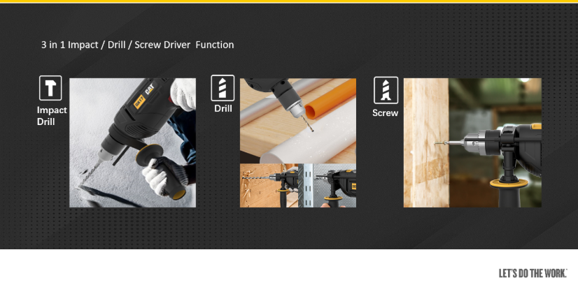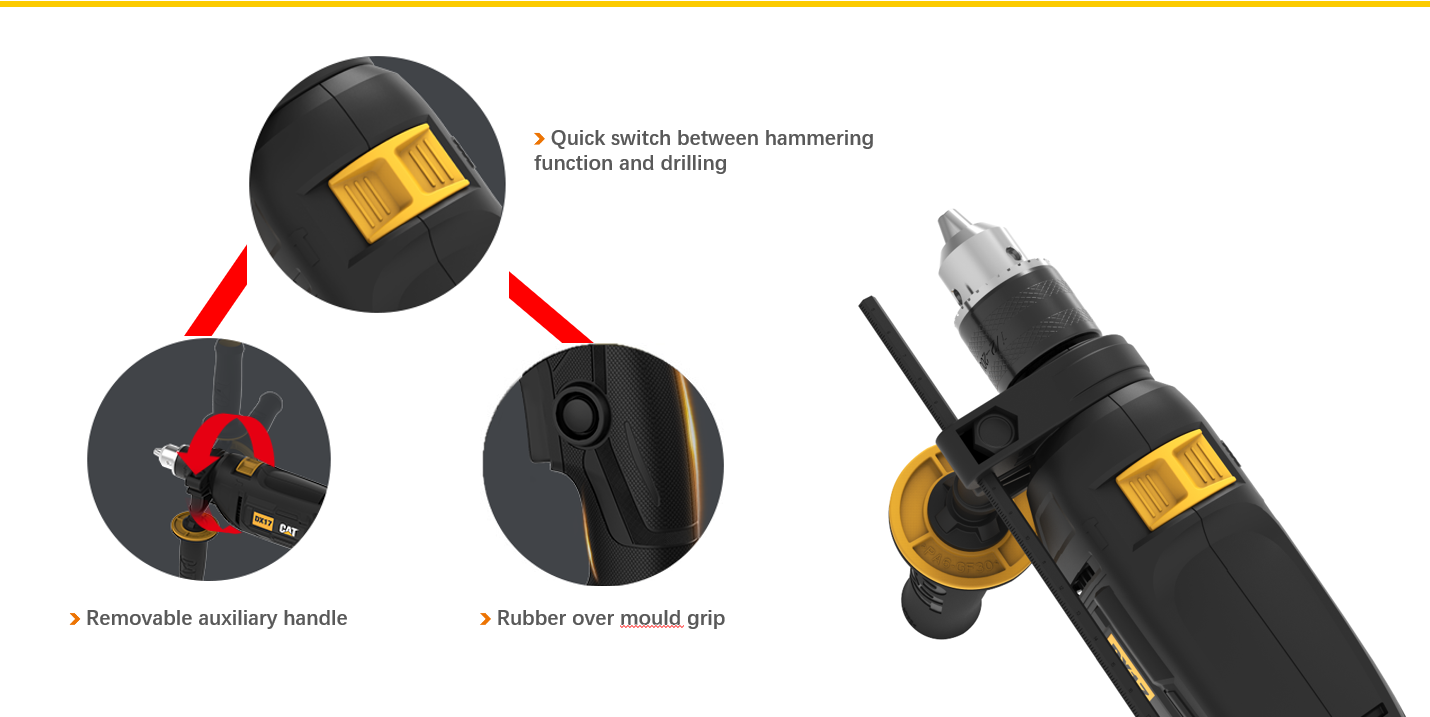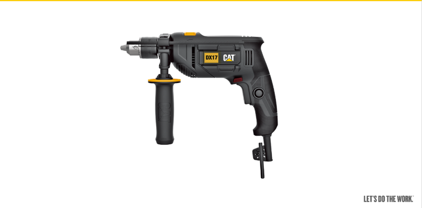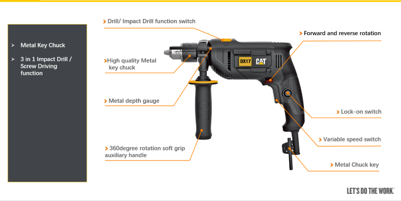The DX17 CAT Hammer includes essential features such as forward and reverse rotation, a variable speed switch for better control, and a lock-on button for continuous operation. A metal depth gauge offers precise drilling depth, while the ball joint cord connection protects the power cable from damage due to bending and twisting during operation.