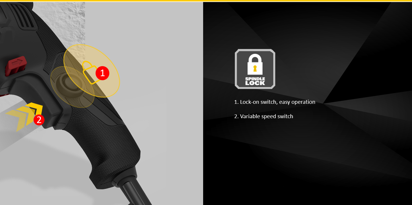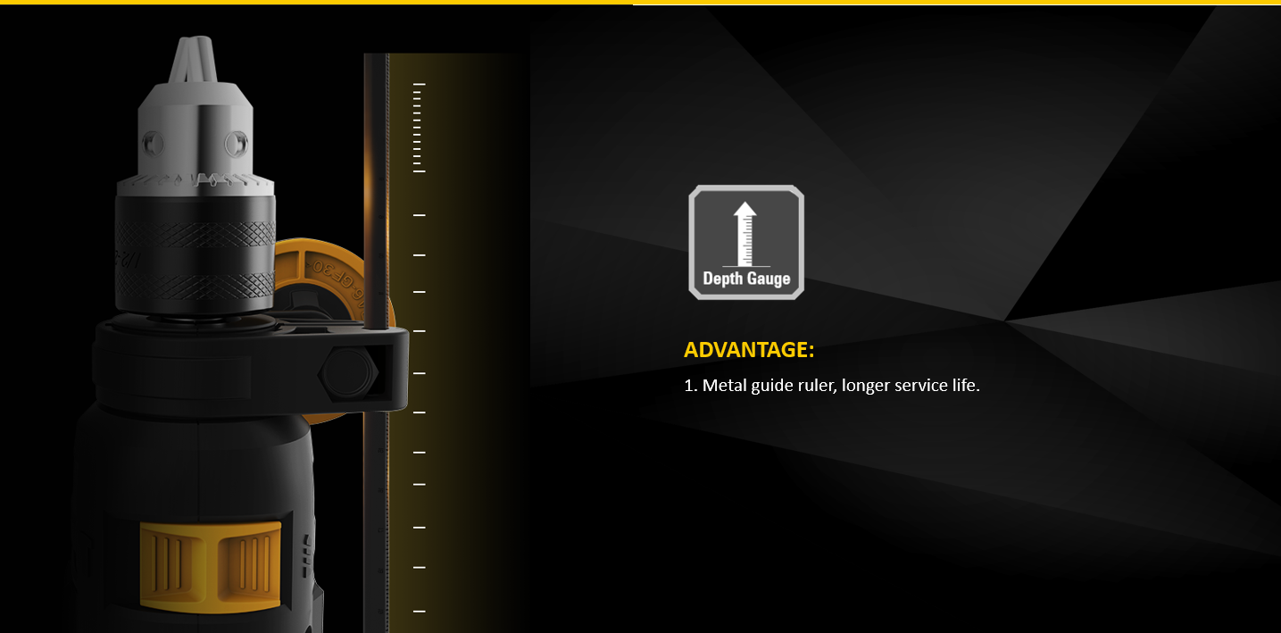 تتضمن المطرقة ميزات أساسية مثل الدوران الأمامي والخلفي، ومفتاح سرعة متغير لتحكم أدق، وزر تثبيت التشغيل للعمل المستمر. كما تأتي مزودة بمقياس عمق معدني للحفر الدقيق، بالإضافة إلى وصلة كابل كروية تحمي سلك الطاقة من التلف الناتج عن الانحناء أو الالتواء أثناء الاستخدام.