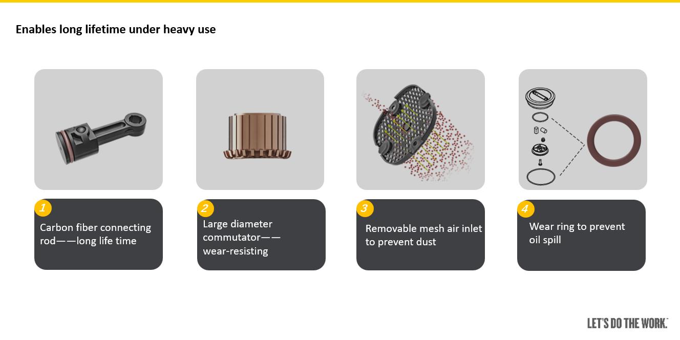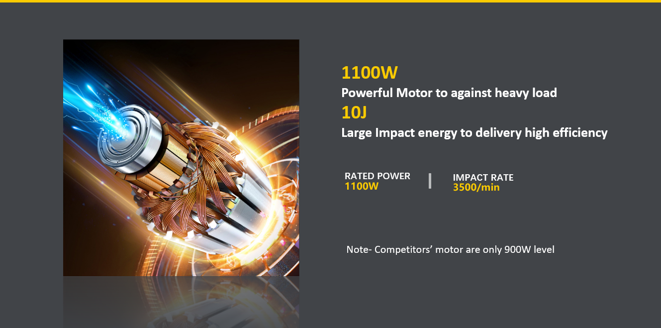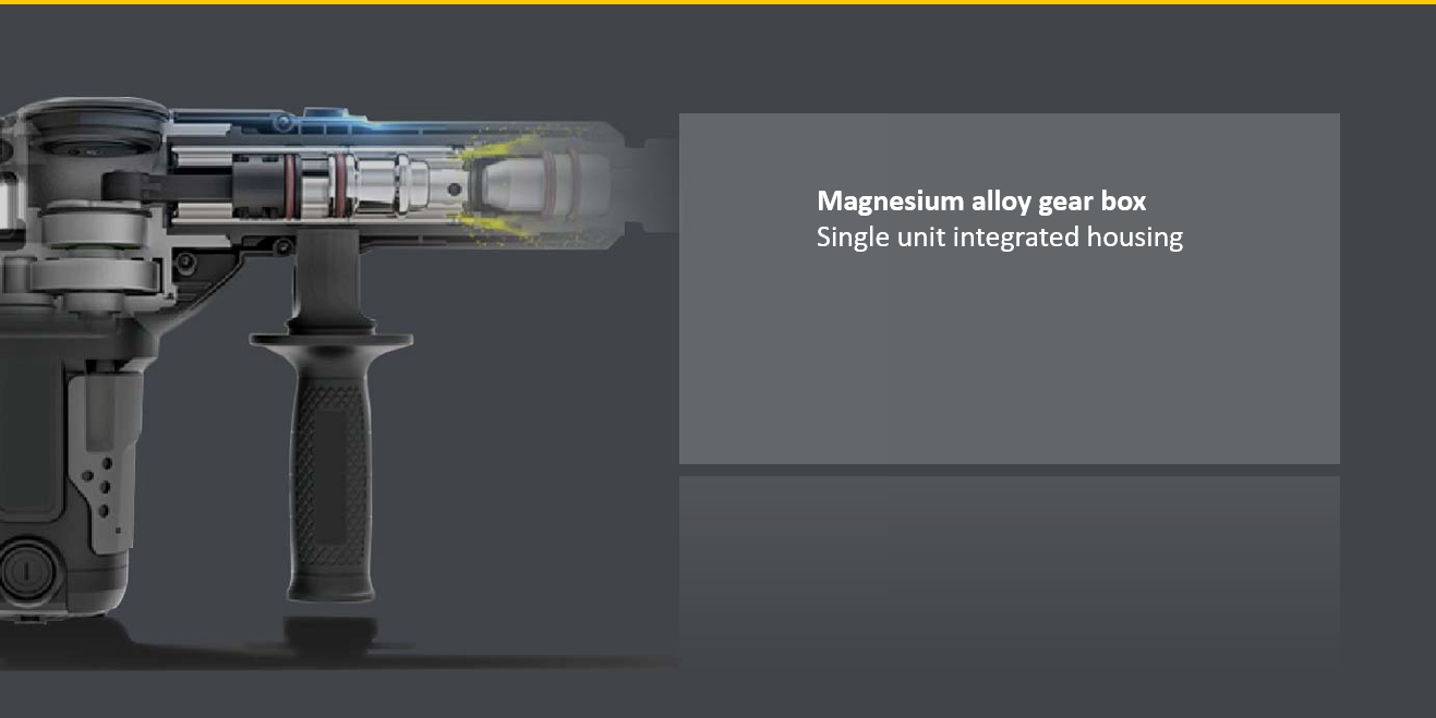 تتميز بوجود زر تشغيل رباعي الأصابع مع ميزة القفل لتسهيل التشغيل المستمر دون الحاجة إلى الضغط المستمر، مما يجعلها مثالية لمهام الهدم الشاقة. يضمن نظام التجويف السداسي تثبيتًا قويًا للُّقم، بينما يتيح الإطار خفيف الوزن والتصميم المتوازن سهولة المناورة في الأماكن الضيقة أو عند العمل فوق الرأس.