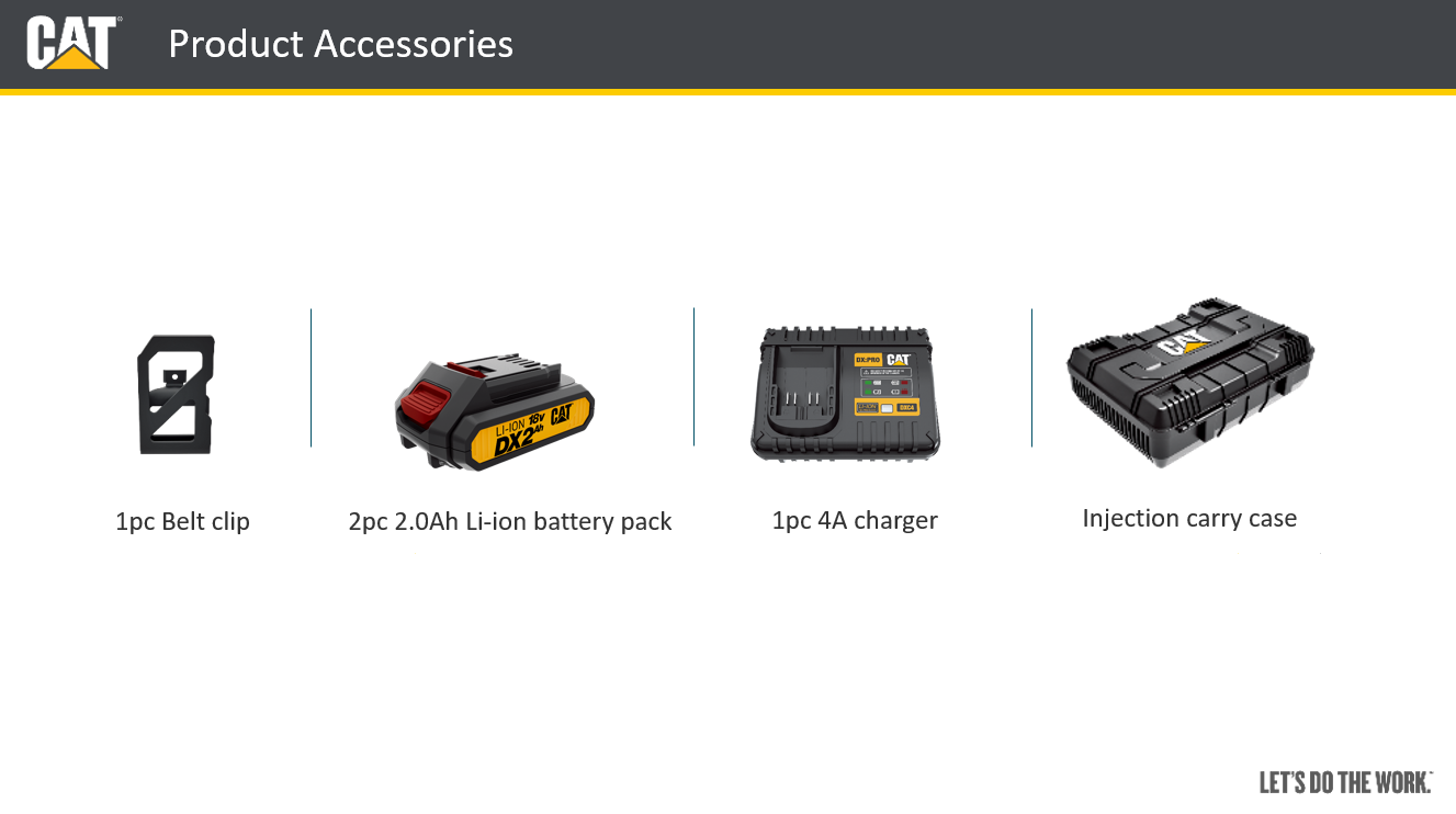 محتويات التسليم | • عدد 2 بطارية ليثيوم أيون بسعة 2.0 أمبير/ساعة • عدد 1 شاحن بقدرة 4 أمبير • عدد 1 مشبك حزام • حقيبة حمل مصبوبة + صندوق ملون |